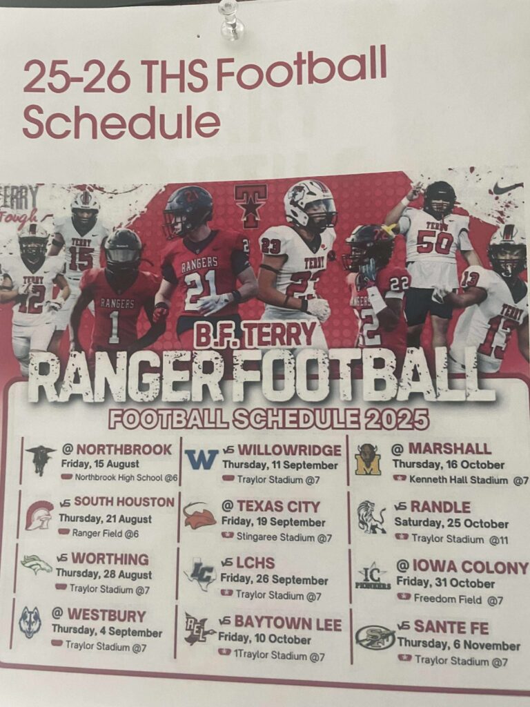 • In the fall, the gridiron is where you can find your Terry Ranger football team. From the first week of August through December, football is the highlight of Texas sports. To prepare for a season of domination, we begin team practices the first week of August, followed by two scrimmages to test our metal. There are 10 regular season games, in which we compete against our oldest rival in The Battle Of The Berg. This year our 34th game will be held at Traylor Stadium where we will extend our impressive record of wins over the Mustangs. But football is not only about winning, but about the character that is developed as we strive to be successful.